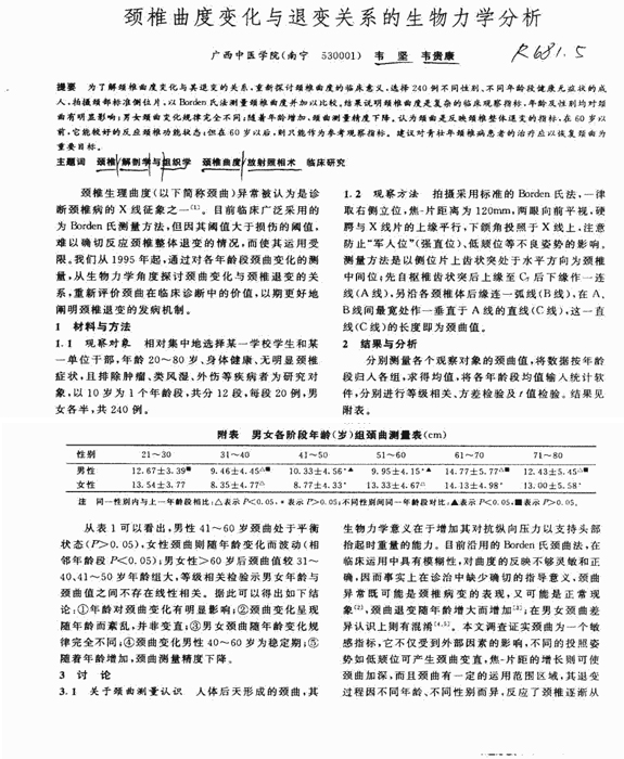 【摘要】:为了解颈椎曲度变化与其退变的关系,重新探讨颈椎曲度的临床意义,选择240例不同性别、不同年龄段健康无症状的成人,拍摄颈部标准侧位片,以Borden氏法测量颈椎曲度并加以比较。结果说明颈椎曲度是复杂的临床观察指标,年龄及性别均对颈曲有明显影响;男女颈曲变化规律完全不同;随着年龄增加,颈曲测量精度下降。认为颈曲是反映颈椎整体退变的指标,在60岁以前,它能较好的反应颈椎功能状态;但在60岁以后,则只能作为参考观察指标。建议对青壮年颈椎病患者的治疗应以恢复颈曲为重要目标。
