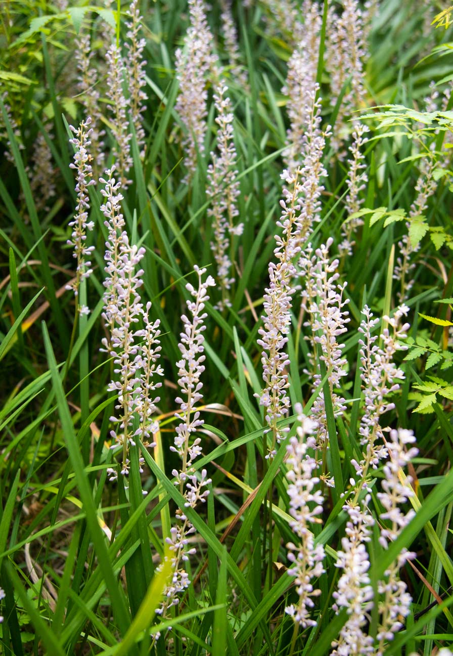 形态特征:多年生常绿草本。叶丛生,窄长线形;花葶比叶短,长7~15cm;总状花序穗状,顶生,小苞片膜质;花梗略弯曲下垂,常于近中部以上有关节;花被片6,披针形,淡紫色或白色;雄蕊6,花丝极短;子房半下位,3室。果实浆果状,球形,熟后暗蓝色。